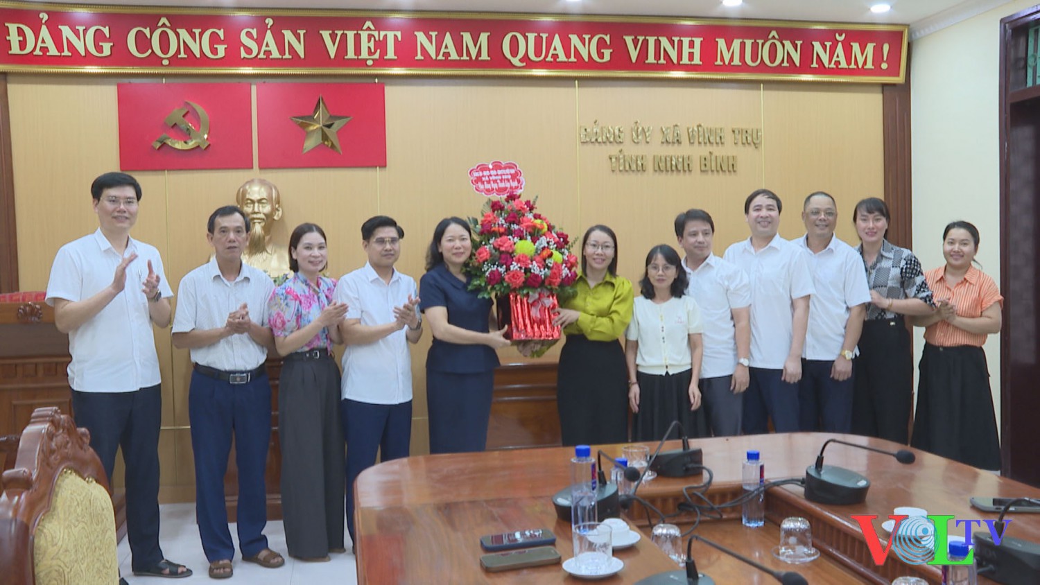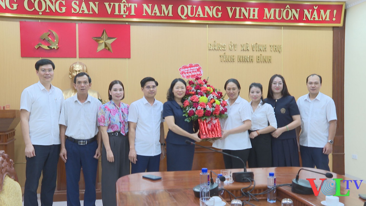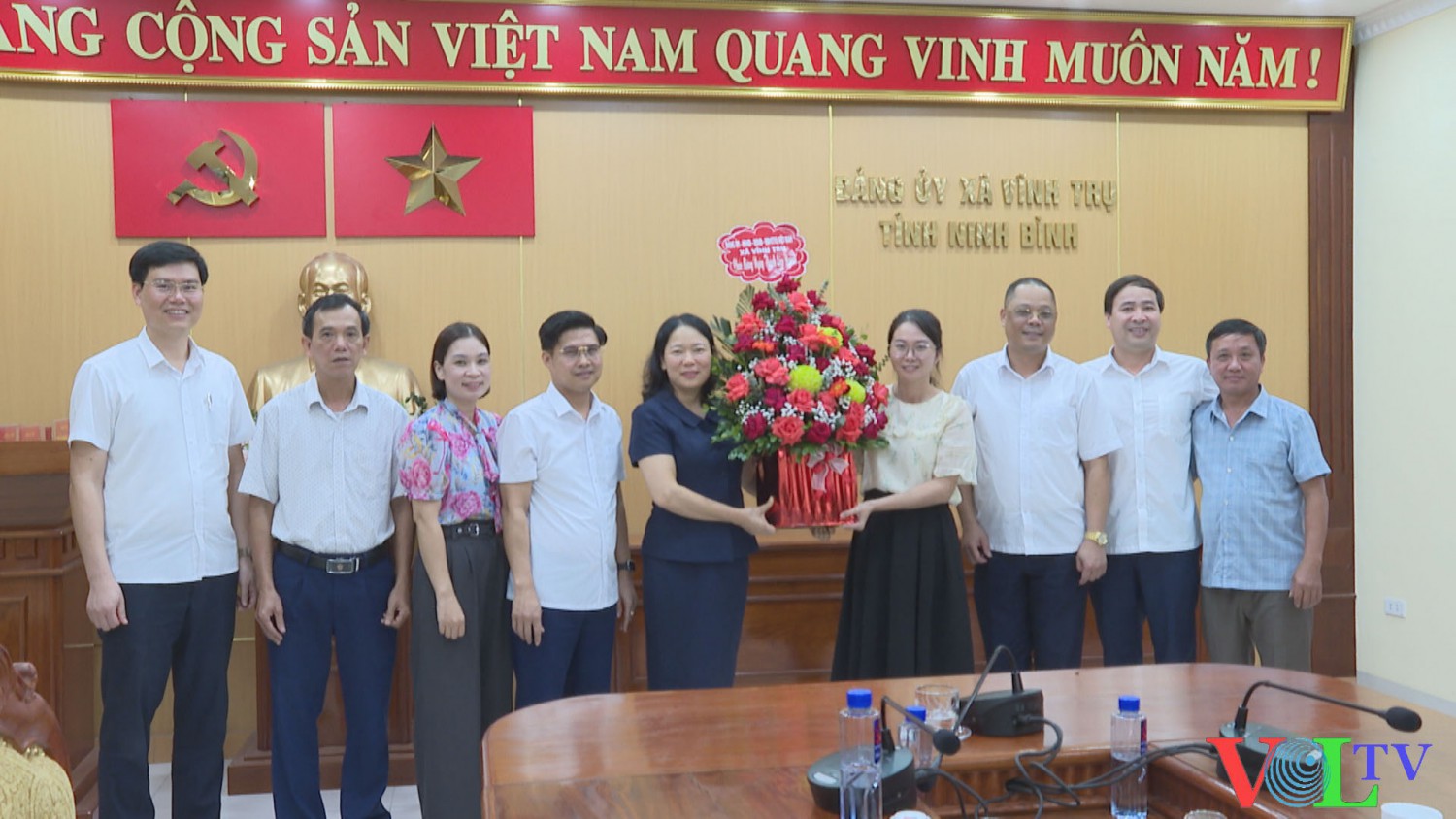 Lãnh đạo xã Vĩnh Trụ tặng hoa chúc mừng các cơ quan.