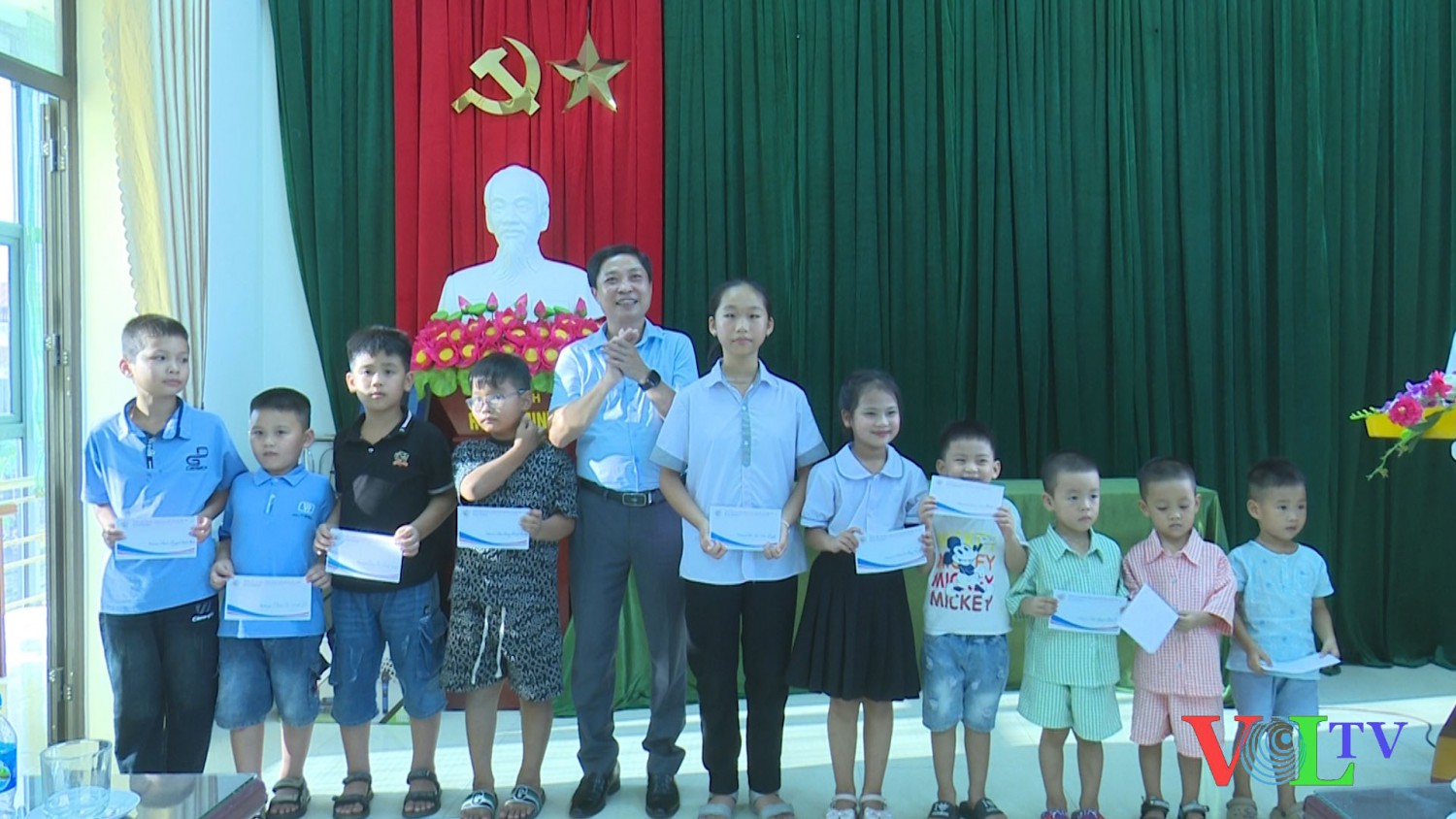 Đồng chí Dương Đức Hiểu - Giám đốc Trung tâm Trung tâm Văn hoá, Thông tin và Thể thao xã Vĩnh Trụ tặng quà cho các cháu đạt thành tích cao trong năm học 2024 - 2025. Ảnh: Văn Phúc