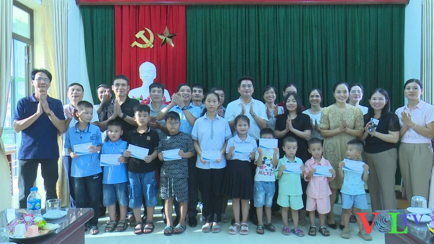 Cán bộ, viên chức, người lao động Trung tâm Văn hoá, Thông tin và Thể thao xã Vĩnh Trụ chúc mừng các cháu học sinh đạt thành tích cao. Ảnh: Văn Phúc